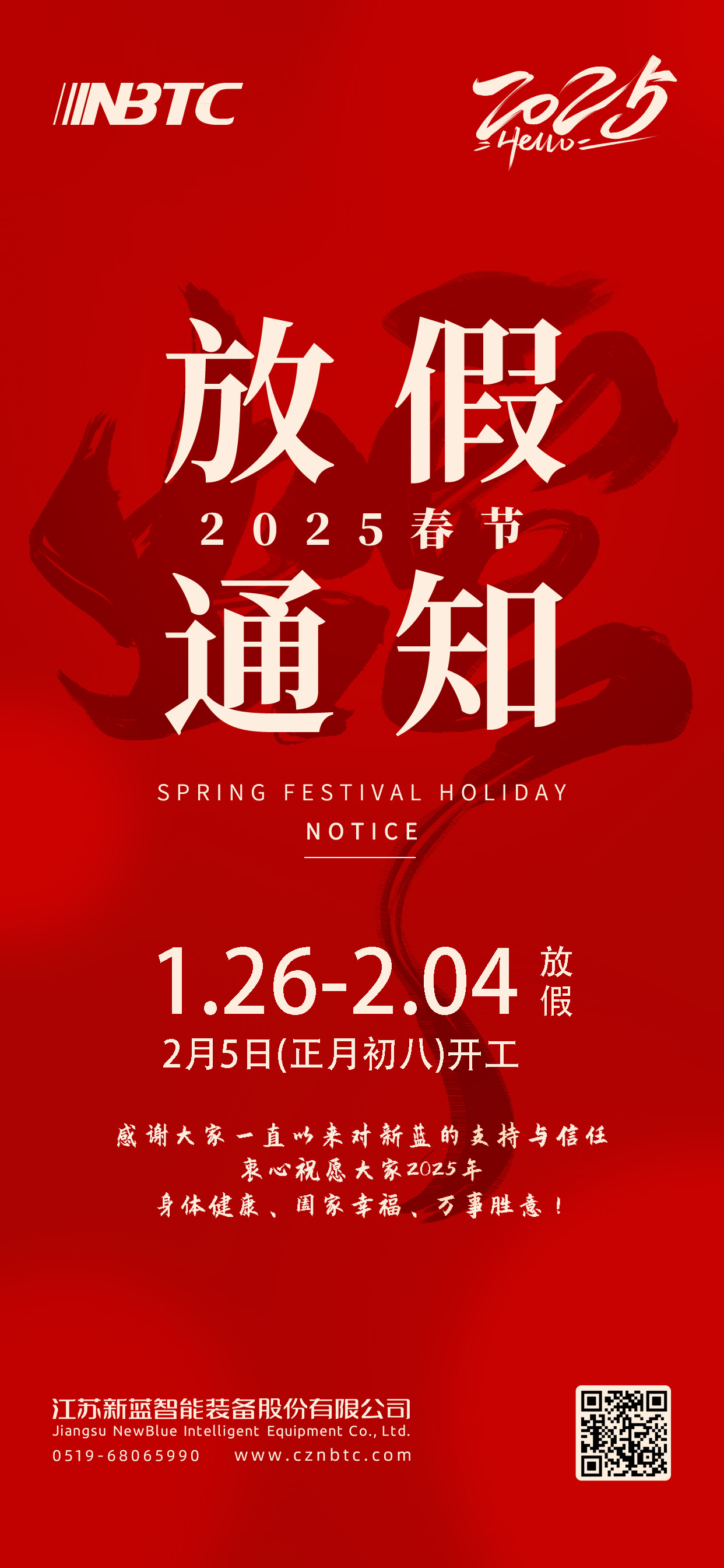 值此新春佳節(jié)來臨之際,江蘇新藍智能裝備股份有限公司向一直以來支持信任我們的各界伙伴致以最誠摯的感謝!根據(jù)公司安排,2025 年春節(jié)放假時間為 1 月 26 日 - 2 月 4 日,2 月 5 日(正月初八)正式開工。在此溫馨提醒大家合理安排假期,放松身心,盡享團圓之樂。新的一年,愿我們攜手共進,再創(chuàng)輝煌!祝大家新春愉快,蛇行大運,闔家幸福,萬事順?biāo)欤?/p>