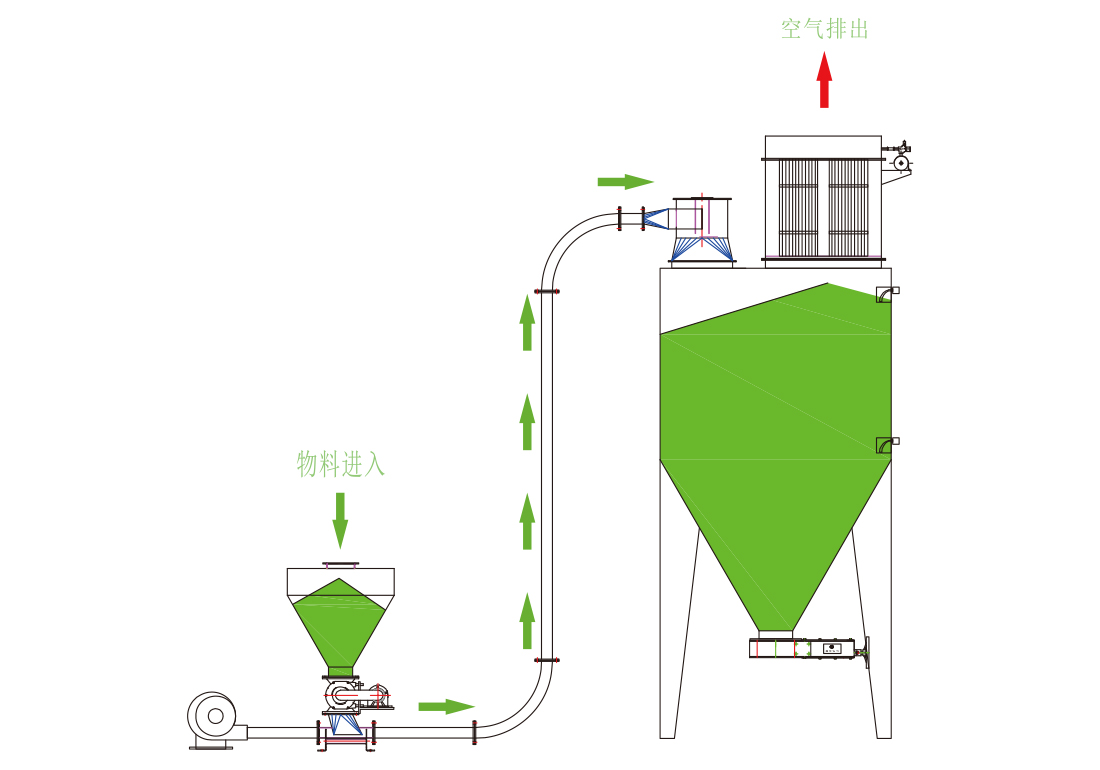 該輸送方式設(shè)備簡單,短距離輸送效果顯著,設(shè)置分路閥可實現(xiàn)從一處向數(shù)處分散物料,位于管路末端的分離器與卸料器簡單。