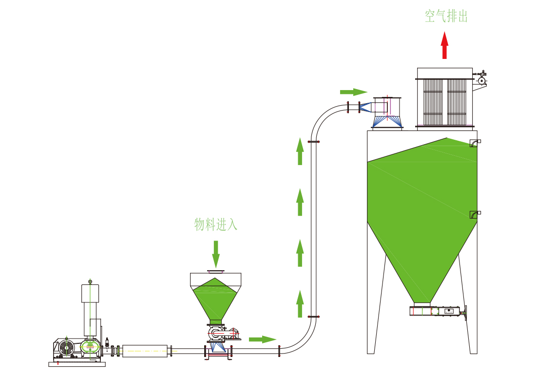 NPM正壓稀相(中壓到高壓)該輸送方式通過位于給料段的噴射器將物料吸入而作壓送,由于輸送空氣的壓損大,所以輸送量與輸送距離受到一定限制。